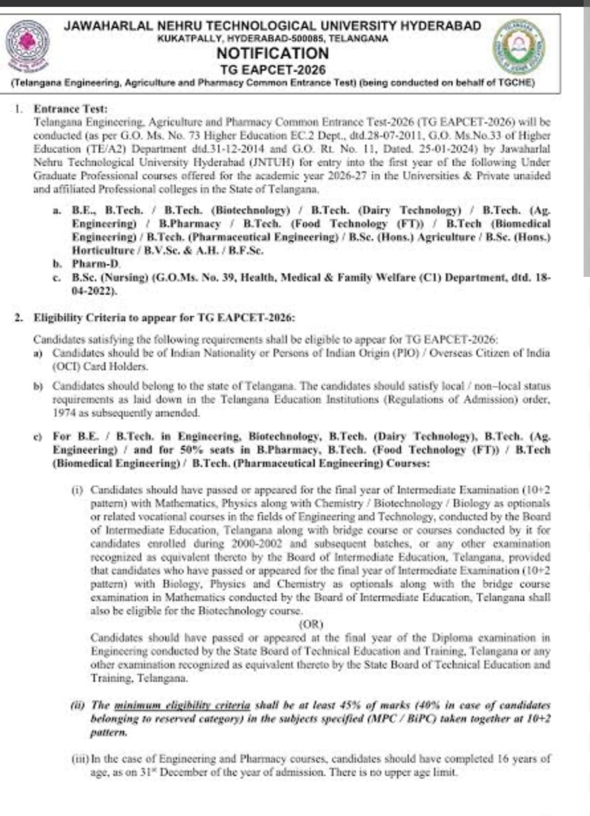 ఇంజనీరింగ్, అగ్రికల్చర్, ఫార్మసీ కోర్సుల్లో ప్రవేశాలకు సంబంధించి ఎప్సెట్-2026 నోటిఫికేషన్ విడుదలైంది. గురువారం నుంచి దరఖాస్తుల స్వీకరణ ప్రక్రియ మొదలుకానుంది. అగ్రికల్చర్, ఫార్మసీ పరీక్షలు మే నెల 4, 5 తేదీల్లో, ఇంజినీరింగ్ పరీక్షలు 9, 10, 11తేదీల్లో నిర్వహించనున్నారు. హైదరాబాదులోని జేఎన్టీయాలో మంగళవారం నిర్వహించిన సమావేశంలో కన్వీనర్ విజయకుమార్ రెడ్డి వివరాలు వెల్లడించారు. దరఖాస్తు, పరీక్ష నిర్వహణలో ఈసారి పలు మార్పులు చేపట్టినట్లు వివరించారు.